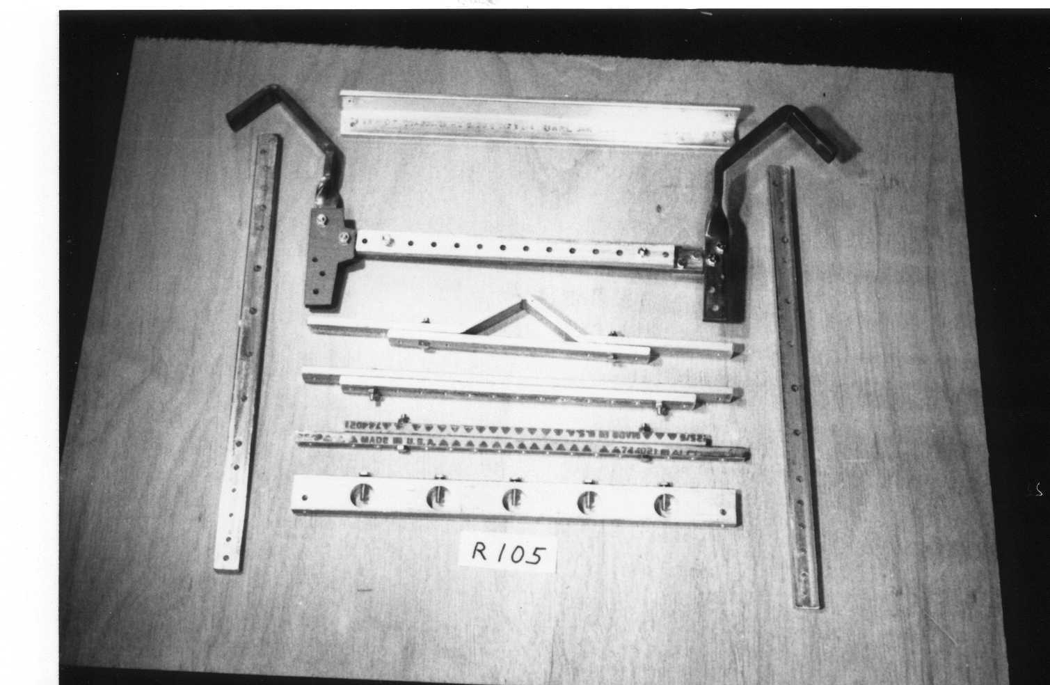 R105 1-inch rack with 5 bottoms (1-inch, 1/2-inch clamping bottom, 1-inch V bottom, 5-hole production bottom, and angle bottom) and 2 side bars. |
