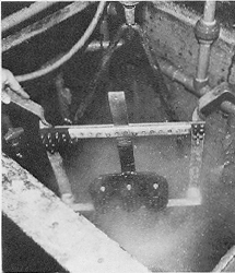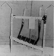 The rack is built as shown with the anode hook and the conforming anode mount insulated from the cathode hook and the "work piece" (cathode) mount. The insulated sections isolate the anode and cathode portions of the reversible rack. The result is that if the anode is mounted from the top and the work piece from the bottom, you incorporate ease of mounting, ease of reversing, and isolation of the part from the activities in the rest of the plating tank. You no longer require a course in imaginative C-clamp application for odd size pieces. You no longer require expensive reversing switches. You may now reverse a part in the same tank you are plating in without affecting the plating of the other parts, you may now plate three to five times as many parts in the same size tank.