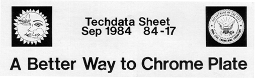 Hard chrome plating is the process of applying a chromium deposit to a part to obtain one or more of the following properties: hardness, low coefficient of friction, corrosion resistance, nongalling and nonwetting qualities, wear resistance, and rebuilding of worn surfaces. Hard chrome plating in Navy applications is usually for building up worn surfaces. The two fundamental elements controlling Navy hard chrome plating are: (1) the engineering quality of the completed product, and (2) operator response time. Economies in operation, so important in commercial plating, are of little significance compared to the value of the reliability of the weapon part being plated. Navy hard chrome plating may require layers of greater than ¼ inch and plating times measured in days.